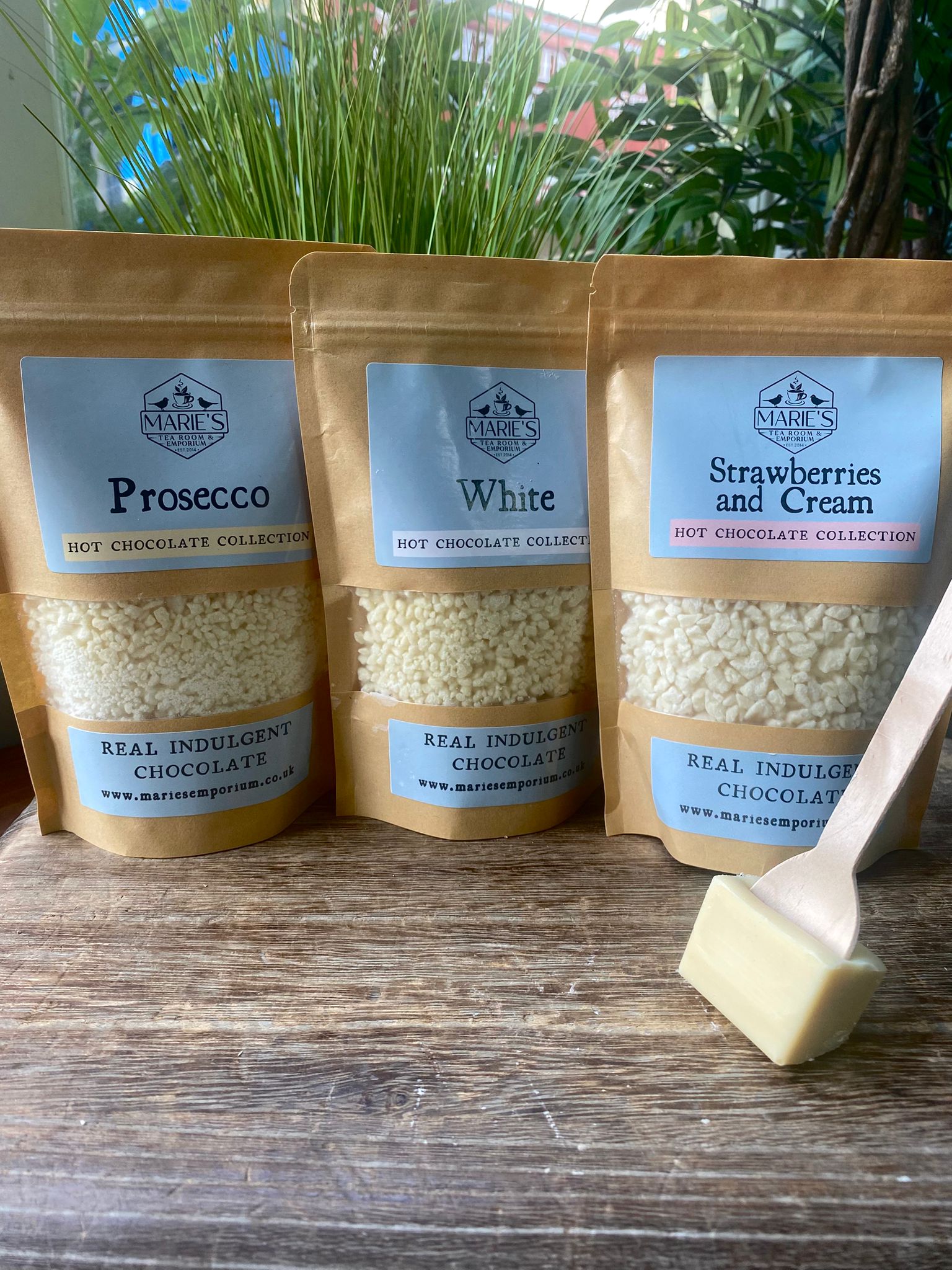 Introducing the White Chocolate Bliss Box, your ultimate indulgence for a luxurious chocolate experience. This beautifully curated box features three exquisite choices of rich white hot chocolate blends, each promising a unique and decadent taste sensation. Flavours include White, Strawberries & Cream, and Prosecco.