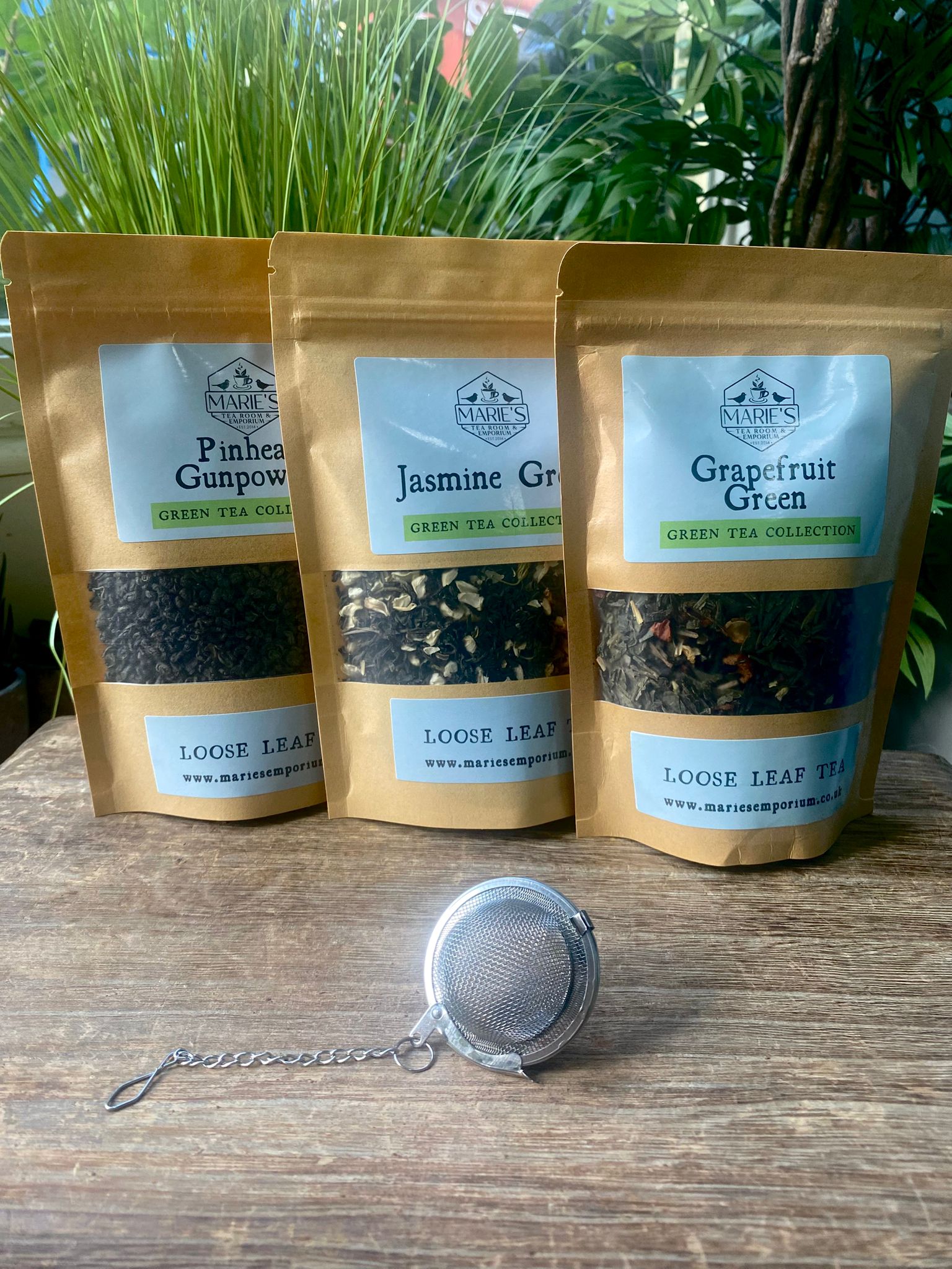 Each collection includes a free stainless steel ball infuser for effortless brewing, along with detailed brew cards to help you perfect each cup. Each 100g bag is carefully sealed to maintain the freshness and quality of these exceptional loose leaf green teas. Elevate your tea moments with Maries Emporium’s Leaf & Brew Green Tea Collection—where sophistication and flavour meet in every sip.
